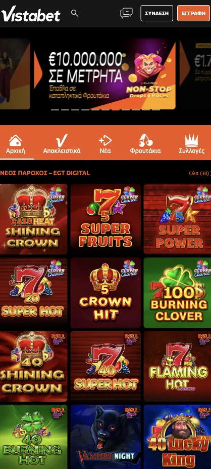 Αν το κύριο ενδιαφέρον σας είναι τα φρουτάκια, θα βρείτε τα φρουτάκια καζίνο Vistabet δίπλα σε επιτραπέζια παιχνίδια και live dealers στο ίδιο mobile μενού. Τρέχουμε επίσης Καθημερινά Τουρνουά Καζίνο και events Pragmatic Play Drops & Wins σε επιλεγμένα παιχνίδια, ώστε οι παίκτες στο κινητό να συμμετέχουν χωρίς αλλαγή συσκευής.